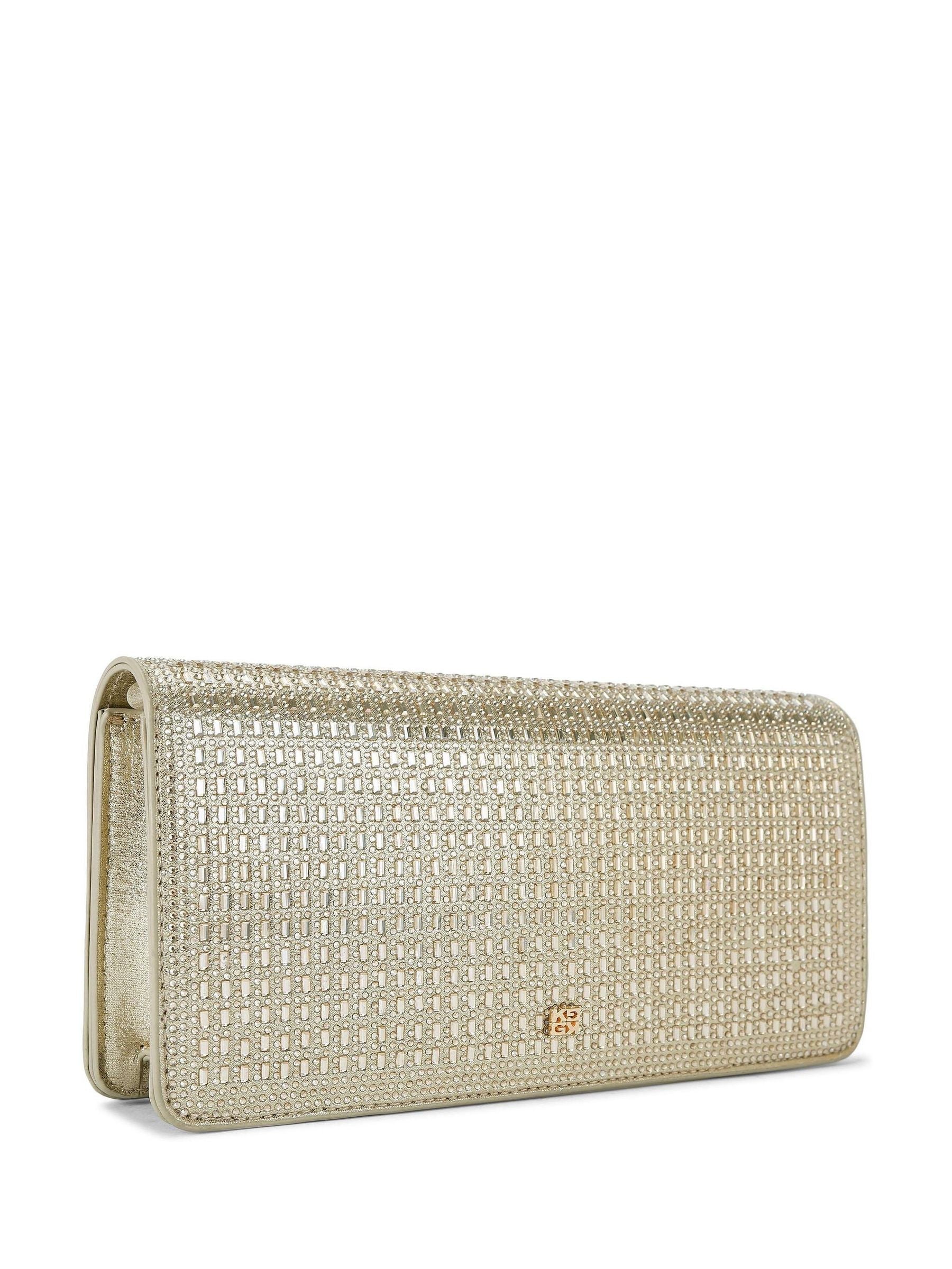 KG Kurt Geiger Fleur clutch çanta, kristal süslemelerle tamamlanmış altın renkli dış yüzeye sahiptir. Arka kısmında altın tonlu pin detayı bulunur. 88 cm uzunluğundaki askısı sayesinde elde veya omuzda taşınabilir.