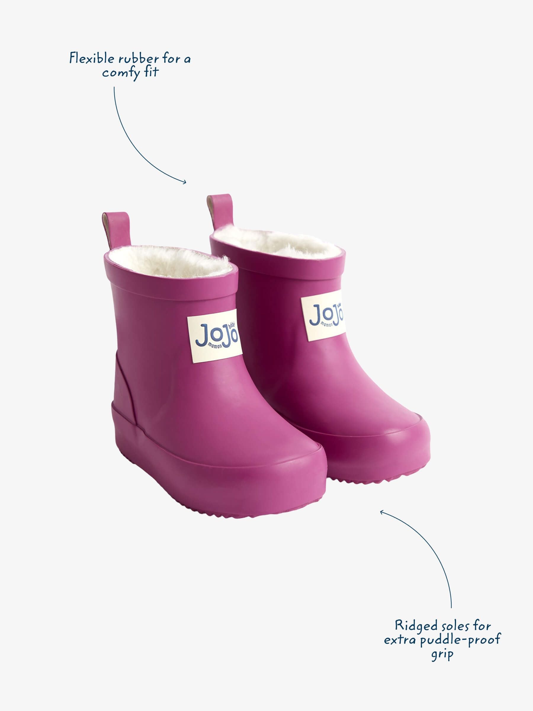 Yağmur çizmelerimiz tartışmasız en popüler seçimlerimizden biridir ve bu sezon, minik su birikintisi kaşifleri bu böğürtlen renkli çiftle her adımda gönlünce sıçrayabilir! Yumuşak, esnek ve sıcak astarı sayesinde plastik Wellington çizmelerden küçük ayaklar için daha rahattır. Çamurlu su birikintilerine atlamak için mükemmeldir; ıslak zeminde ekstra denge sağlayan dişli, tutuşlu bir tabana sahiptir.