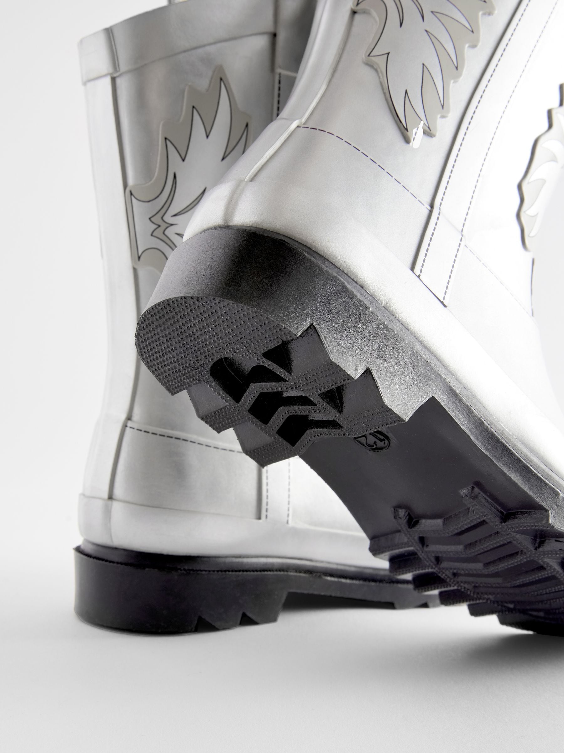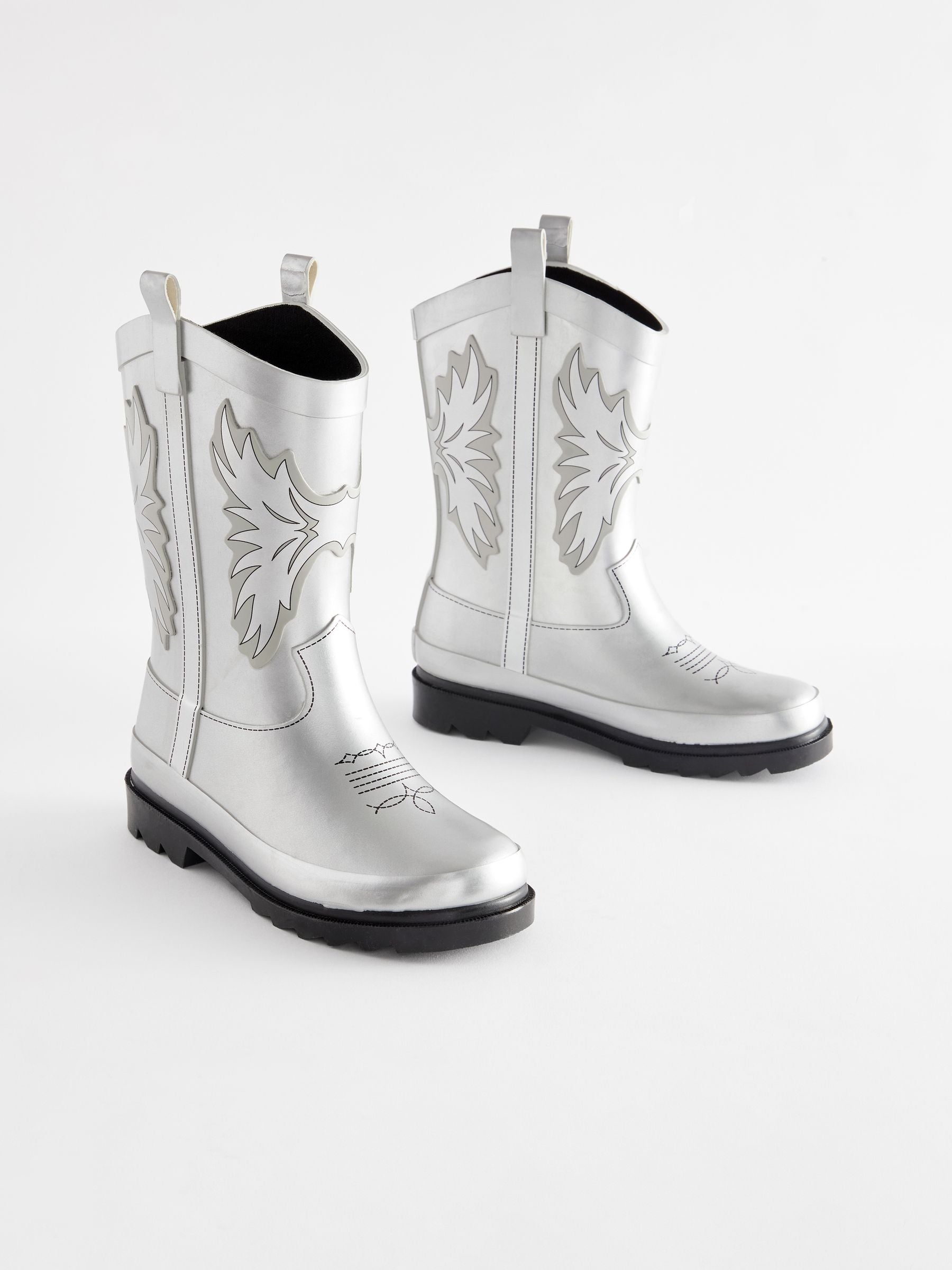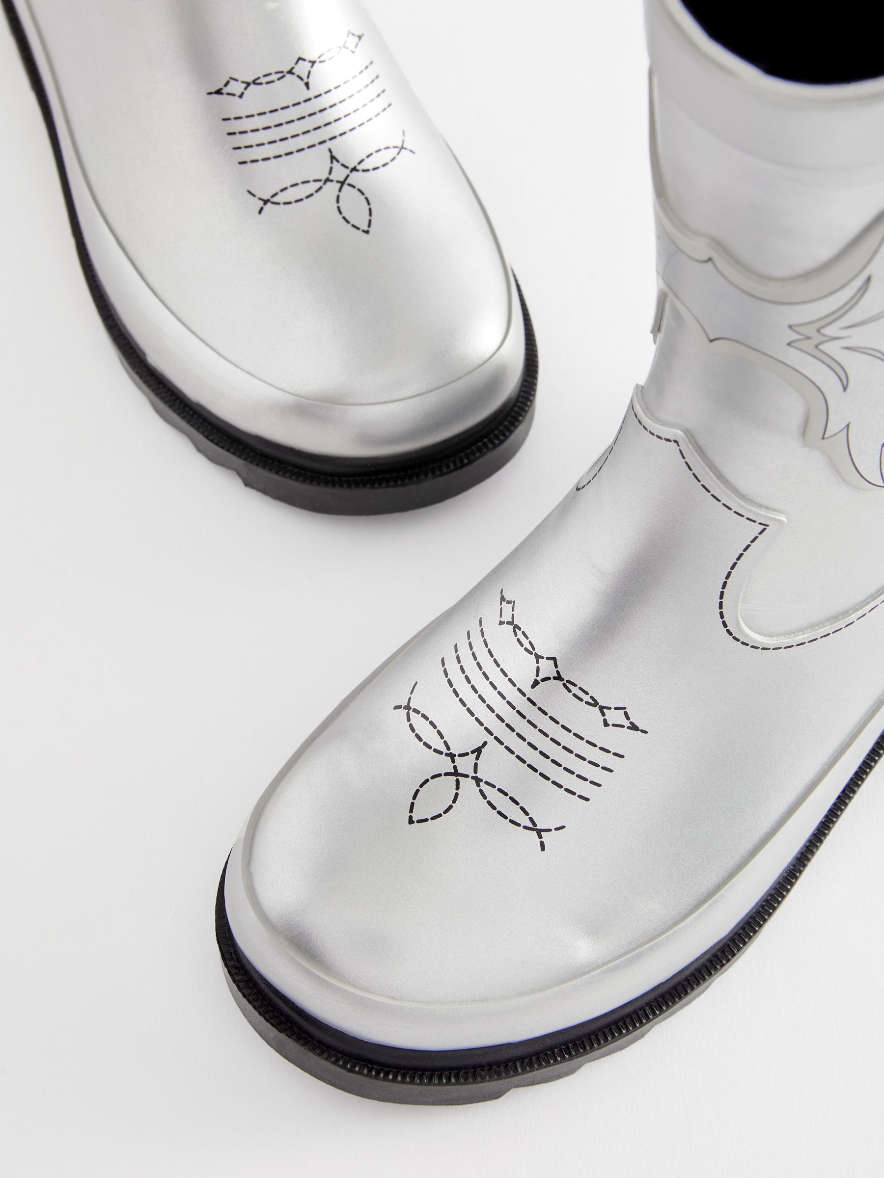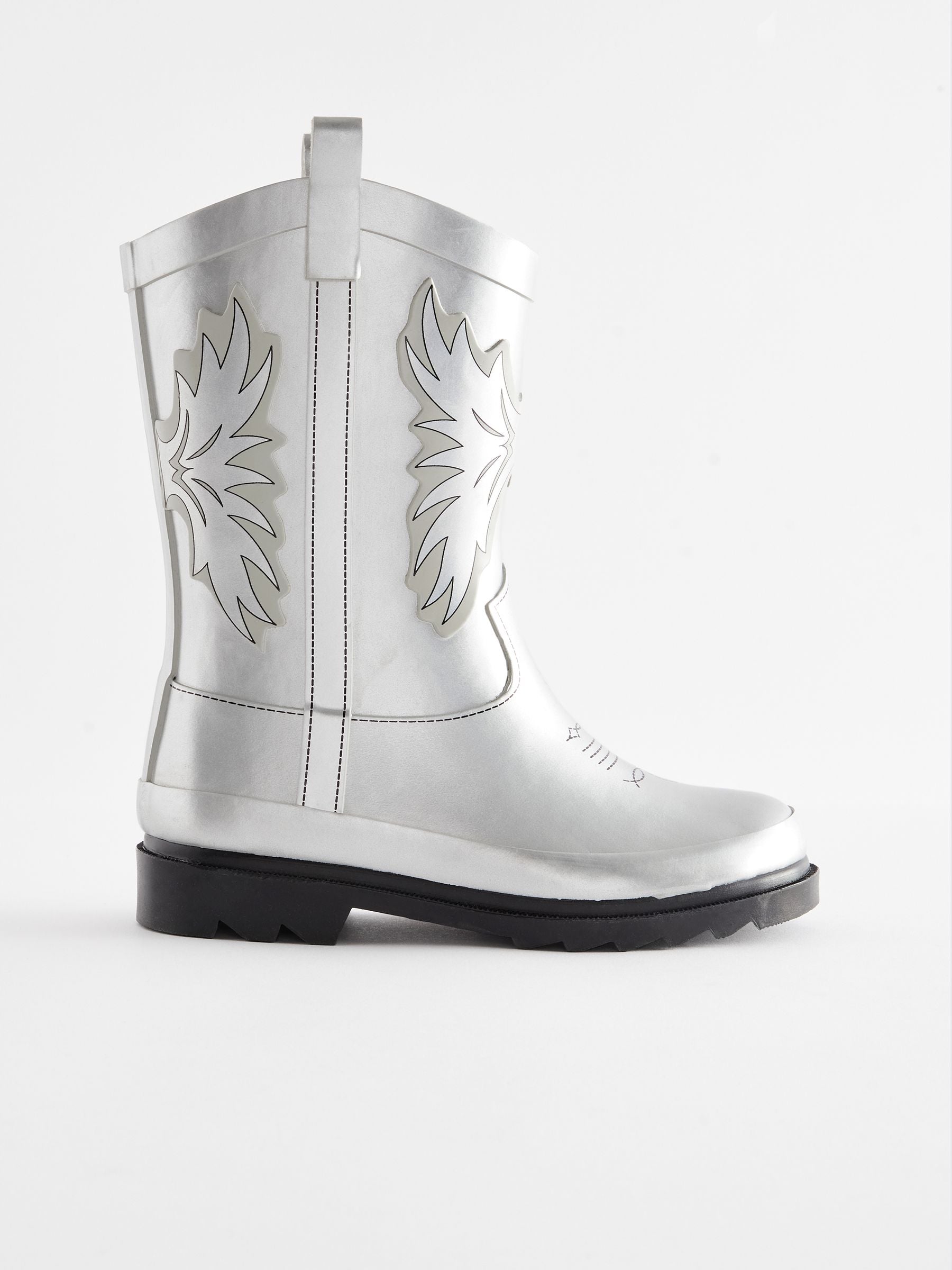Bu uzun, gümüş metalik western esintili wellington çizmelerle su geçirmez ayakkabılarına biraz “yee-haw” katın. Yüksek formu, nakışlı western detayları ve çift çekme halkasıyla, bu çizmeler dayanıklı ve kaymaz bir tabanla tamamlanmıştır.